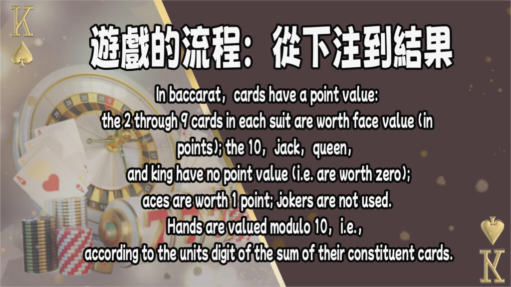 在百家樂中,牌的點數是非常重要的。每張撲克牌都有它自己的點數,比如數字牌(2 到 9)都保持其面值,A牌值1點,而10、J、Q、K的牌值為0點。