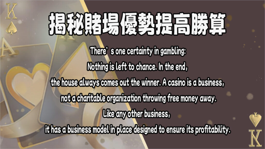 There’s one certainty in gambling: Nothing is left to chance. In the end, the house always comes out the winner. A casino is a business, not a charitable organization throwing free money away. Like any other business, it has a business model in place designed to ensure its profitability.